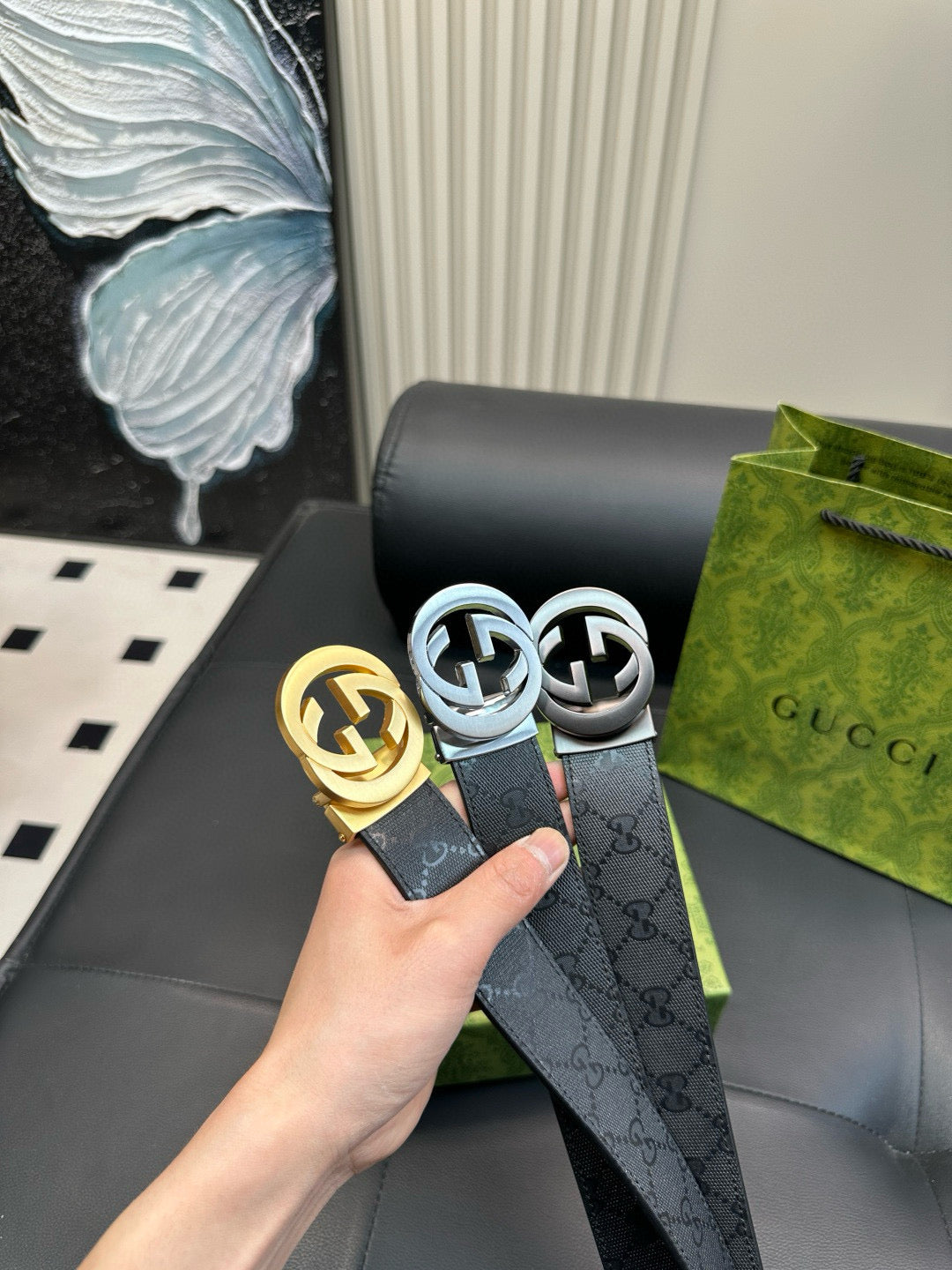 GG Matte surface, with printed pattern on the leather strap
